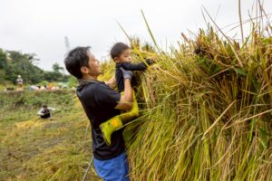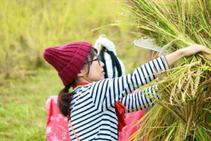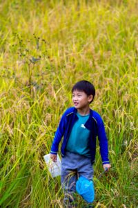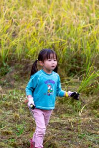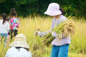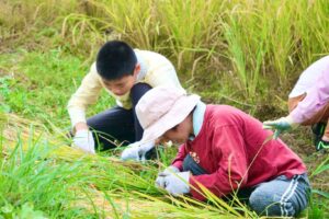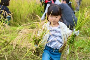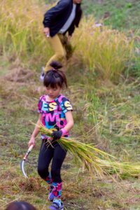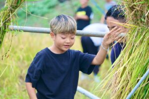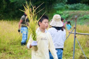 2025.10.12.㈰ 第4回親子で稲刈り体験会を開催しました。悪天候により2度の延期にも関わらず、14家族42名のご参加いただくことができました。ご都合つけていただきありがとうございました。